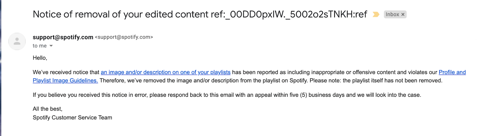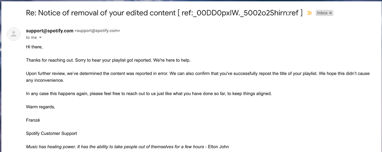 Spotify は、メールの一番下にそれを綴り、あなたは返信して、あなたのplaylist が誤って削除されたことを知らせなければなりません。残念ながら、Redditにあるように、何度も連絡する必要があるかもしれません。