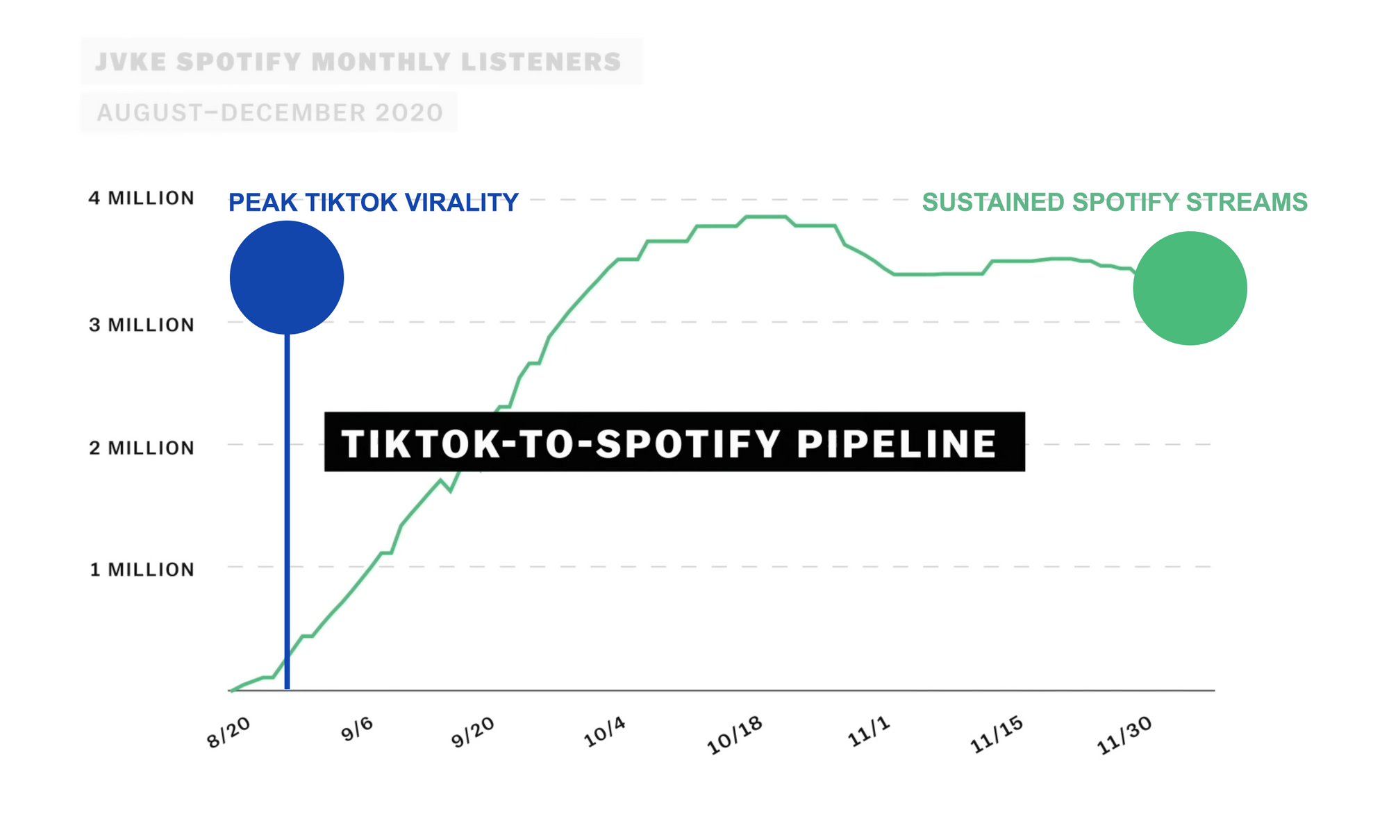 簡単に言うと、TikTok でバイラルになるとリスナーが急増し、それがSpotify playlists に載り、Spotify アルゴリズムを発動させるサイクルが発生します。